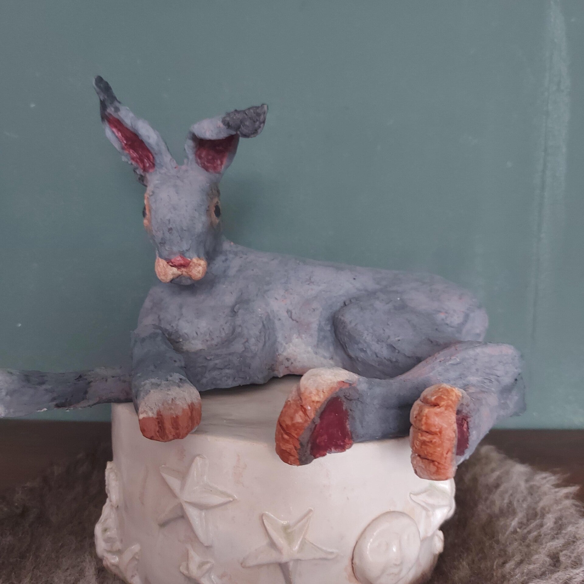 Keramische haas, bewerkt met majolica, mat. Ligt los op een keramische ronde geglazuurde sokkel met figuren erop. Prachtig item!